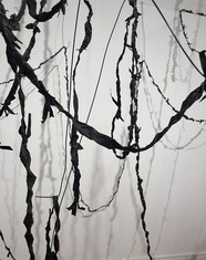 Otra obra aparece antes de la de Tiempo de espera. Esta se titula Cordón, y es una instalación construida también con trenzas de fieltro amarradas y sostenidas con delicados alambres que se apoyan en distintos puntos del techo, dibujando un recorrido por la sala. La estructura es frágil y está en equilibrio.